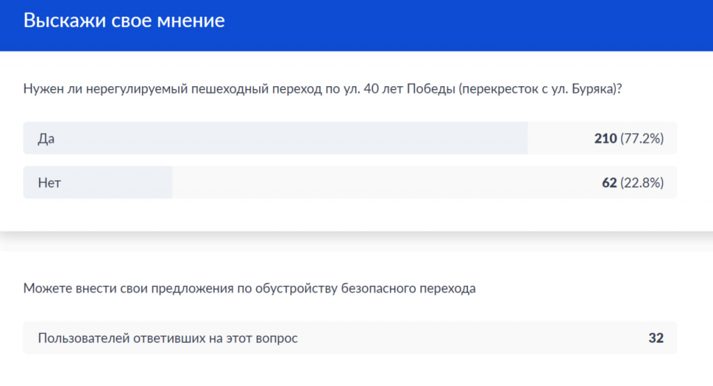В конце февраля в официальных аккаунтах в социальных сетях администрации Югорска прошел опрос о необходимости установки нерегулируемого пешеходного перехода на ул.40 лет Победы (перекресток с ул. Буряка).