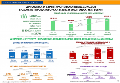 В 2022 году общий объем неналоговых доходов по сравнению с 2021 годом увеличился на 35,8 млн.рублей или 25,7%. Неналоговые доходы составили 175,1 млн. руб., из них 77,4 млн. рублей поступили от использования муниципального имущества, (в основном от аренды земельных участков), 88,2 млн. рублей - от продажи активов (в основном квартир).
