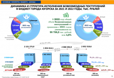 «В заключении хотелось бы подчеркнуть, что исполнение бюджета 2022 года осуществлялось в условиях восстановления экономики после пандемии. В целом удалось профинансировать в полном объеме все социально значимые расходные обязательства и другие направления деятельности, которые были на 2022 год. Все ограничения, которые установлены Бюджетным кодексом Российской Федерации соблюдены. 17 апреля состоялись публичные слушания по проекту отчета. Годовой отчет рассмотрен, проверен и принят Департаментом финансов Югры», - подытожила Ирина Мальцева.
