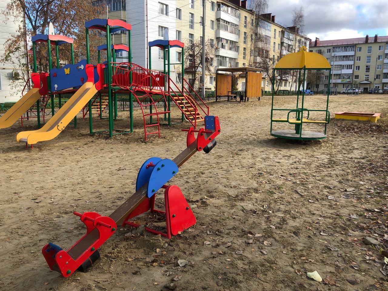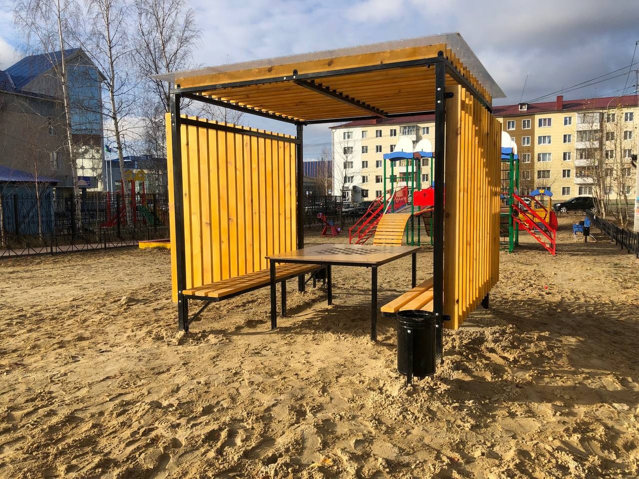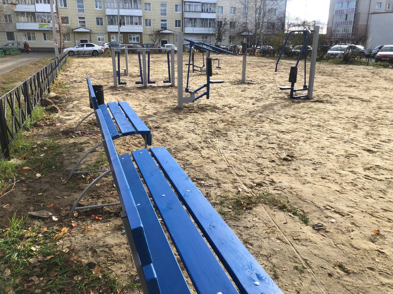 Завершилось обустройство 2 пешеходных тротуаров, установка новых ограждений, 5 скамеек, 7 урн, 7 уличных тренажёров, детского городка, качелей и беседки.