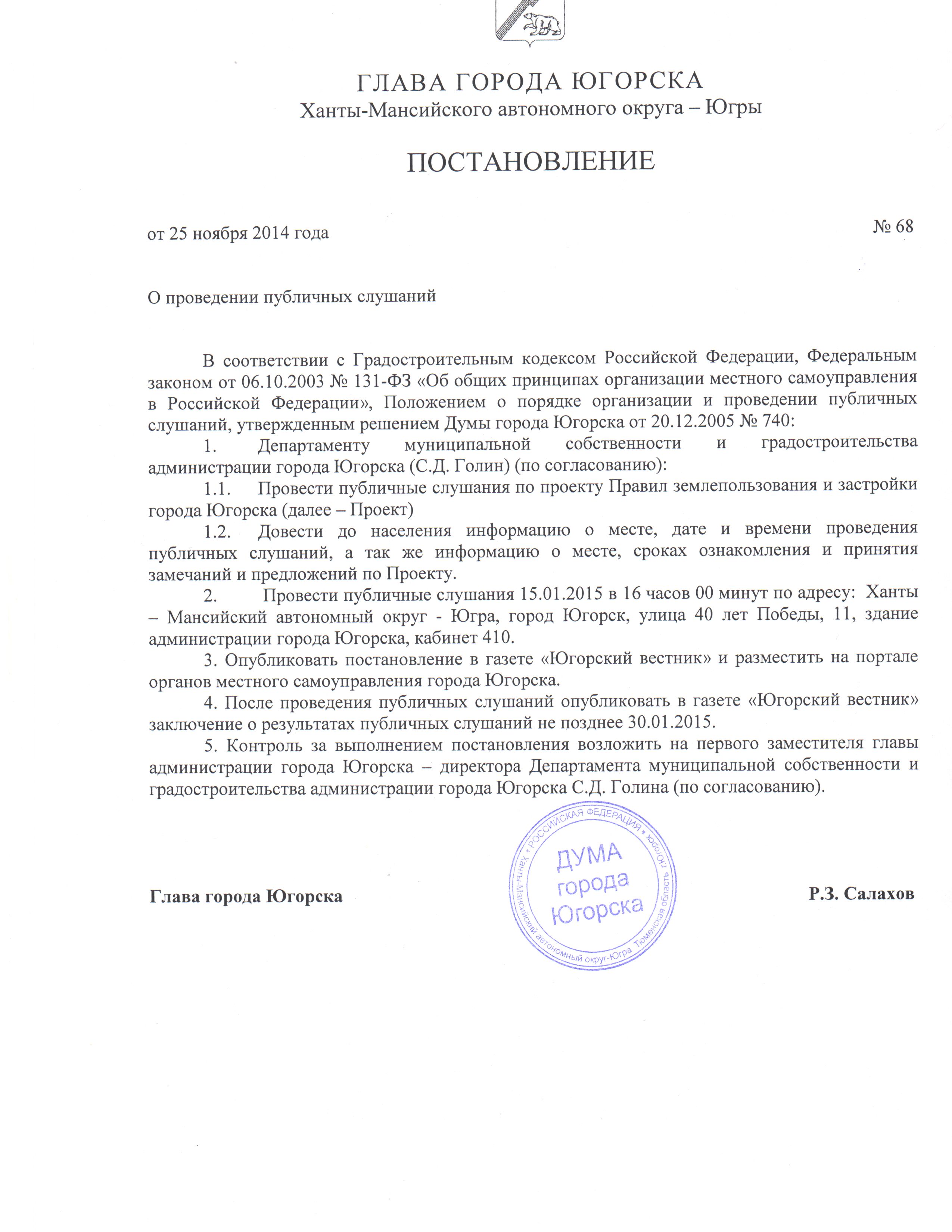15 января 2015 года в 16 часов 00 минут по адресу: Ханты-Мансийский автономный округ-Югра, город Югорск, улица 40 лет Победы, 11, 4 этаж, кабинет 410 будут проводиться публичные слушания по проекту Правил землепользования и застройки города Югорска.